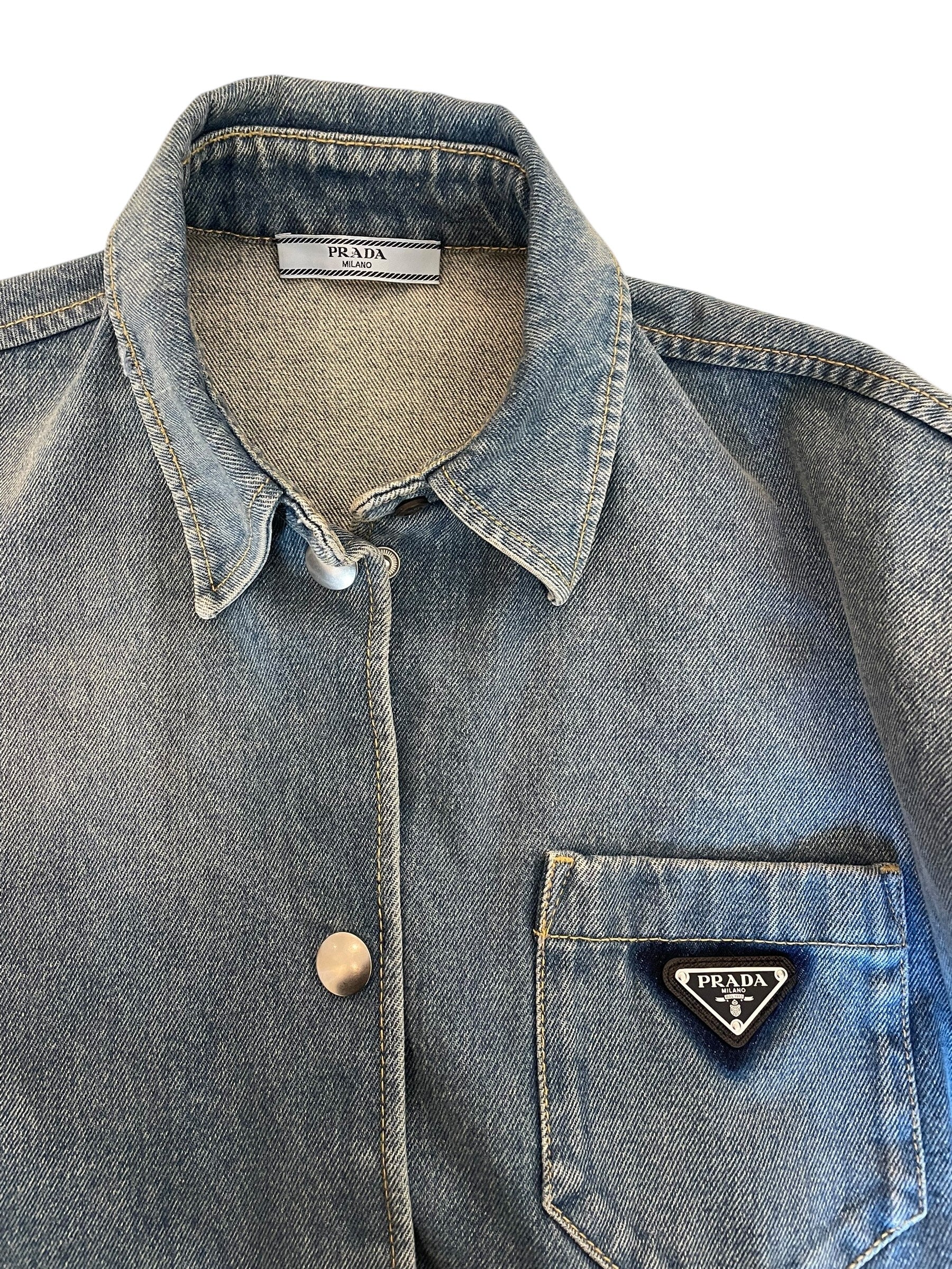 Version raffinée du luxe décontracté, cette chemise en denim Prada est confectionnée en denim épais bleu clair structuré pour une silhouette épurée et architecturale. Ornée du logo iconique Prada sur la poitrine, elle se porte aussi bien oversize, en tunique, voire en mini-robe pour un look chic et sans effort. Un basique polyvalent et moderne en excellent état. Taille 42.