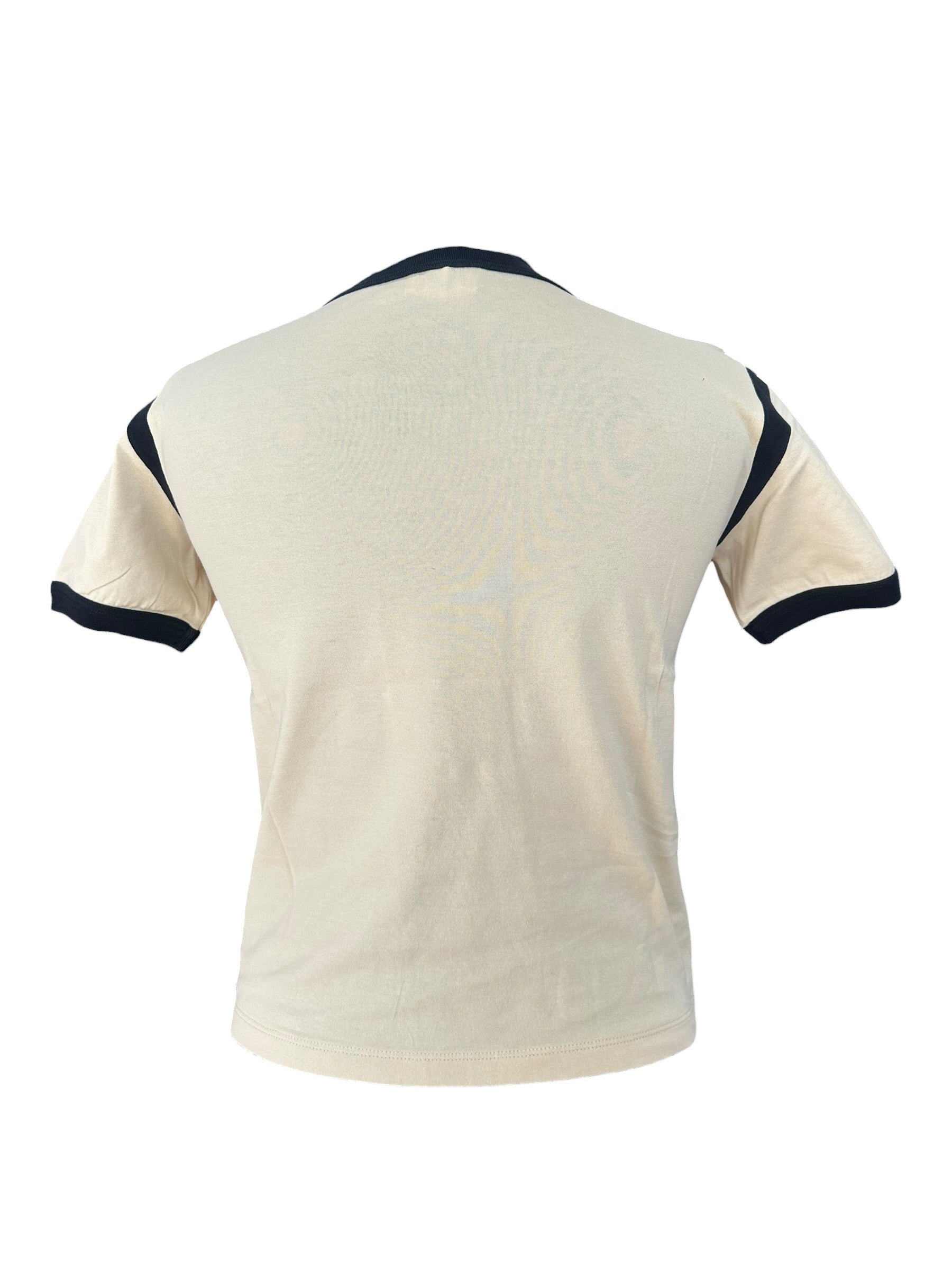 Une coupe courte et près du corps qui s'arrête parfaitement à la taille. La base beige adoucit le contraste du logo noir, rendant la pièce facile à intégrer tout en étant présente. Le coton a un toucher propre et lisse, gardant sa forme sans être rigide. Une pièce simple qui encadre la silhouette avec précision.