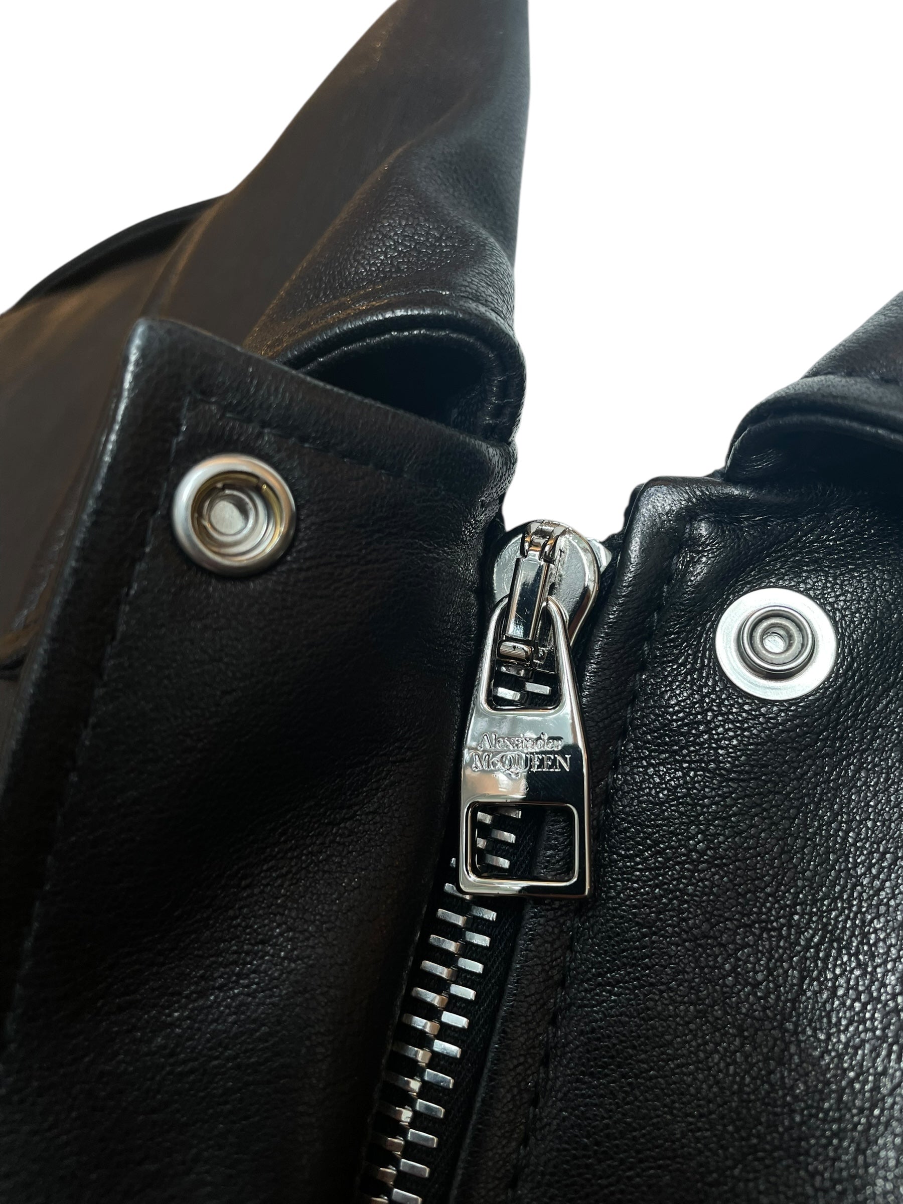 This striking Alexander McQueen jacket redefines the classic biker silhouette with a modern, sculptural twist.