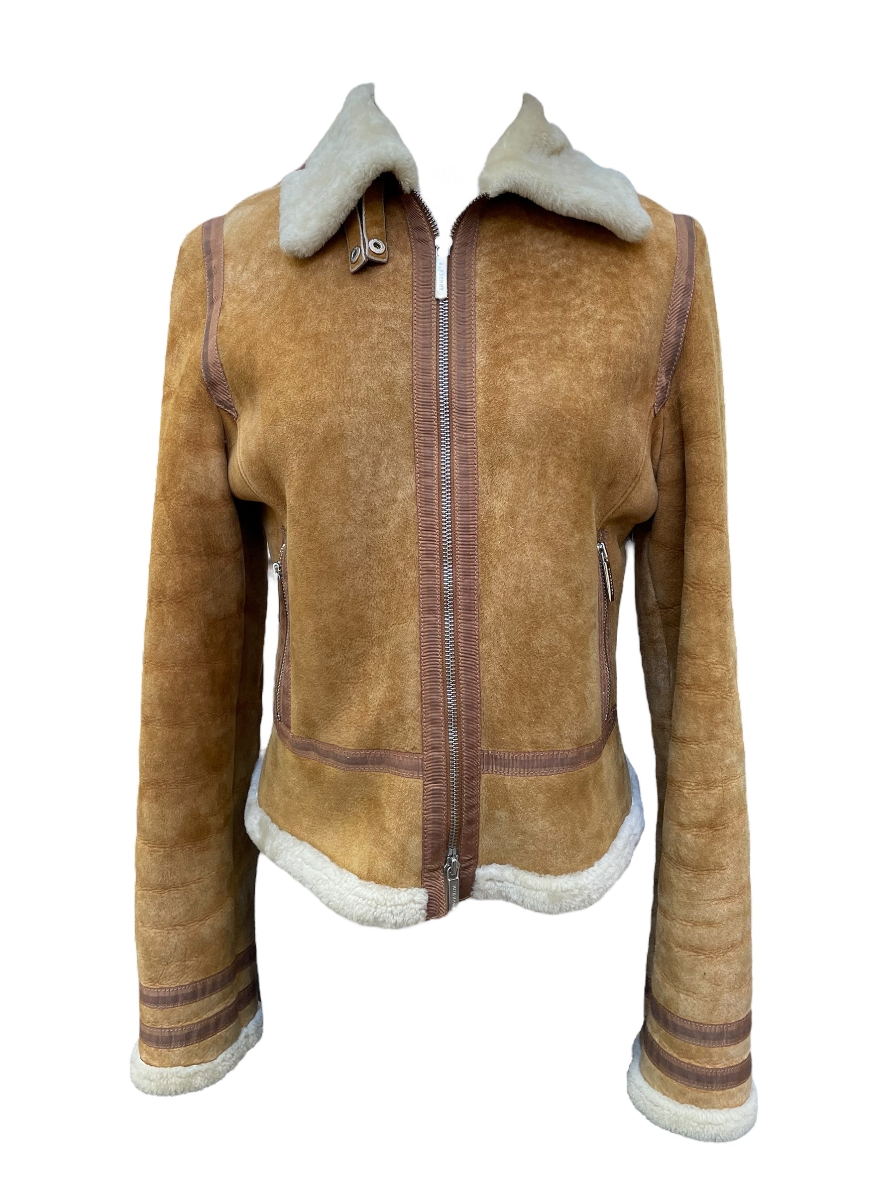 This Burberry jacket, made of soft, supple shearling, is distinguished by its luxurious comfort and incredibly soft feel. The fitted, tailored cut enhances the figure, while the high collar can be raised and fastened with press studs, offering an elegant and practical style.