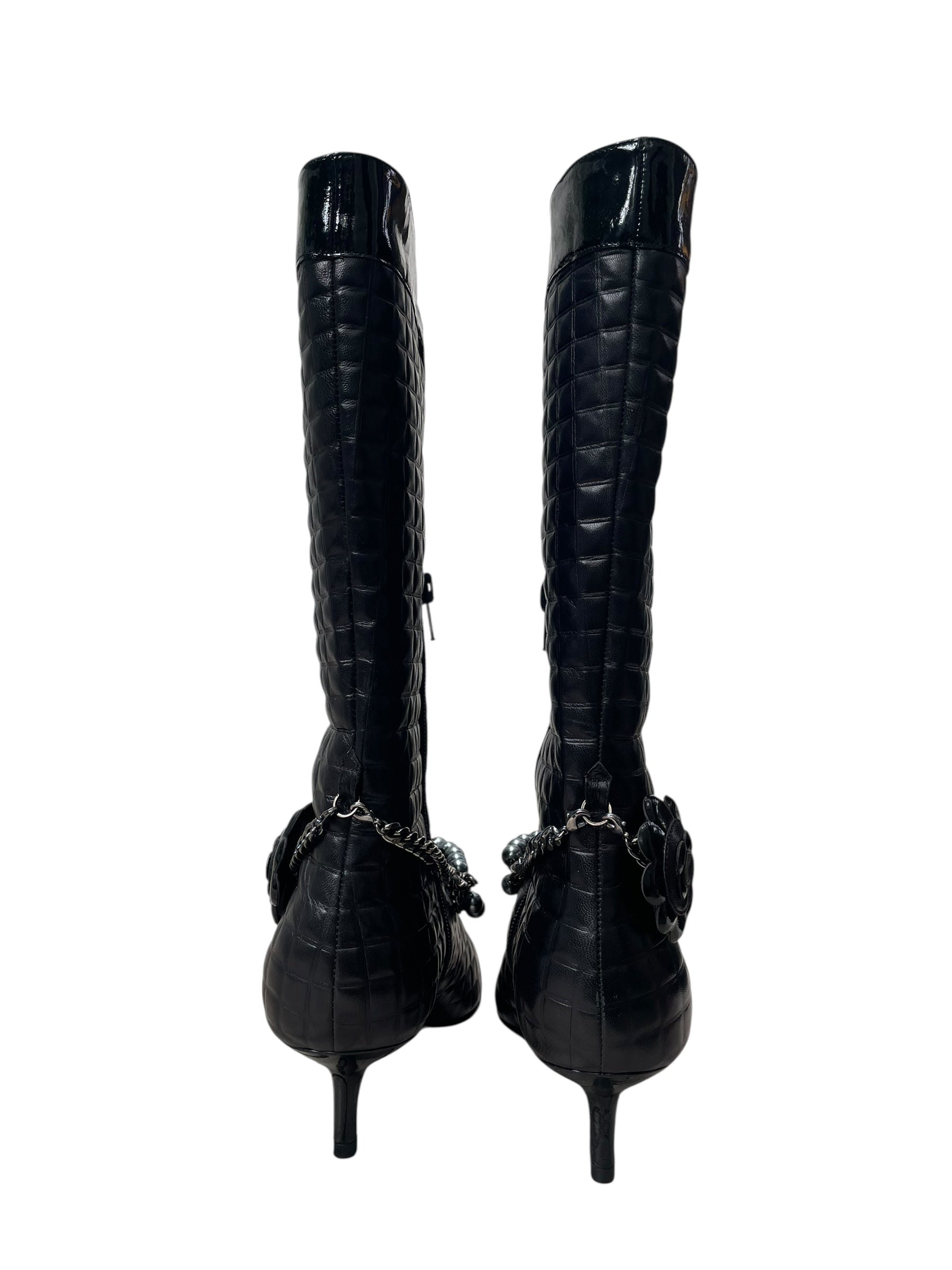 Details: Quilted leather, chain & camellia, patent toe, small kitten heel