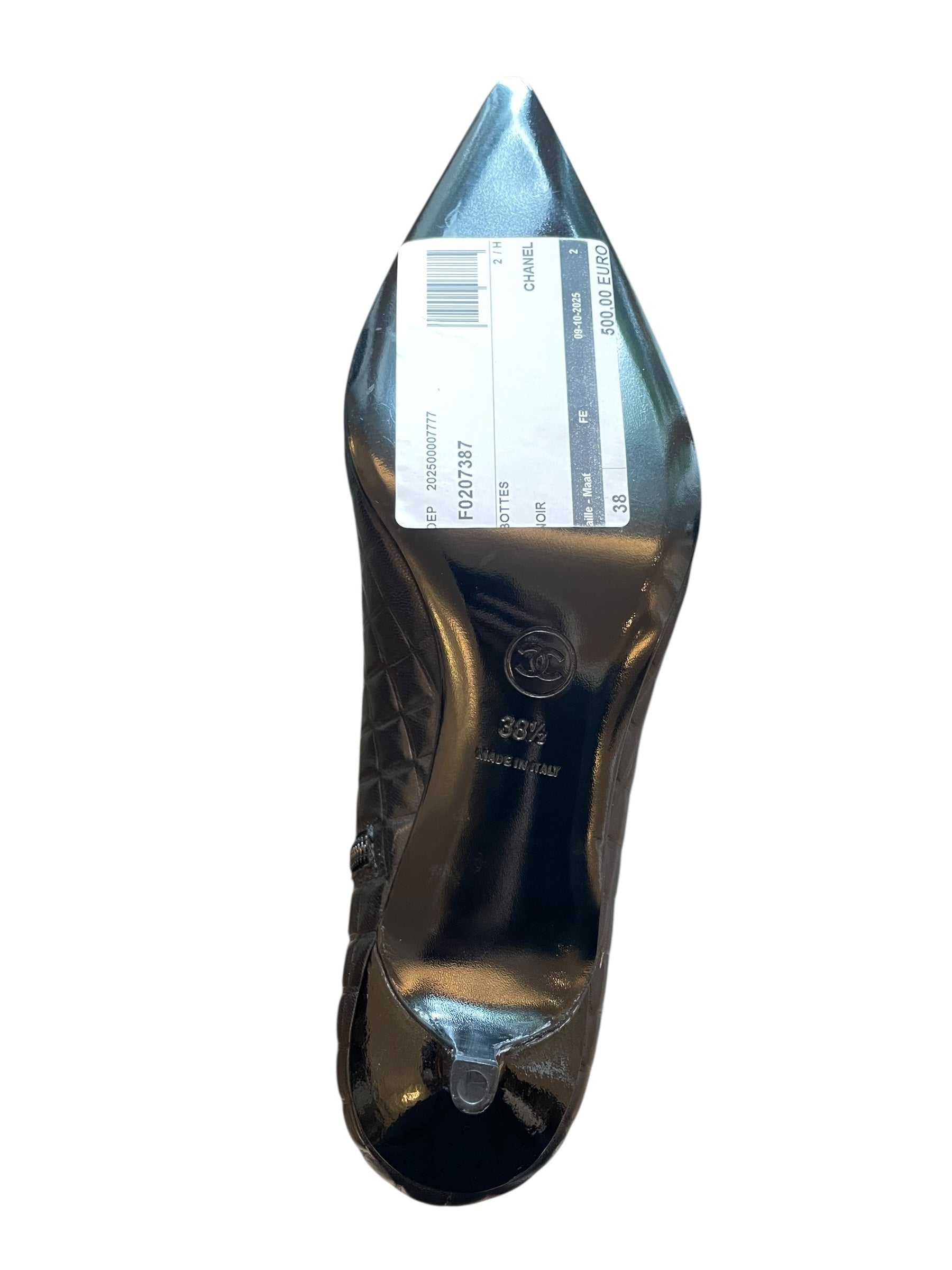 Elegant mid-calf Chanel ankle boots in black quilted-effect leather, enhanced by a delicate chain adorned with a camellia falling over the ankle—an iconic Chanel detail.