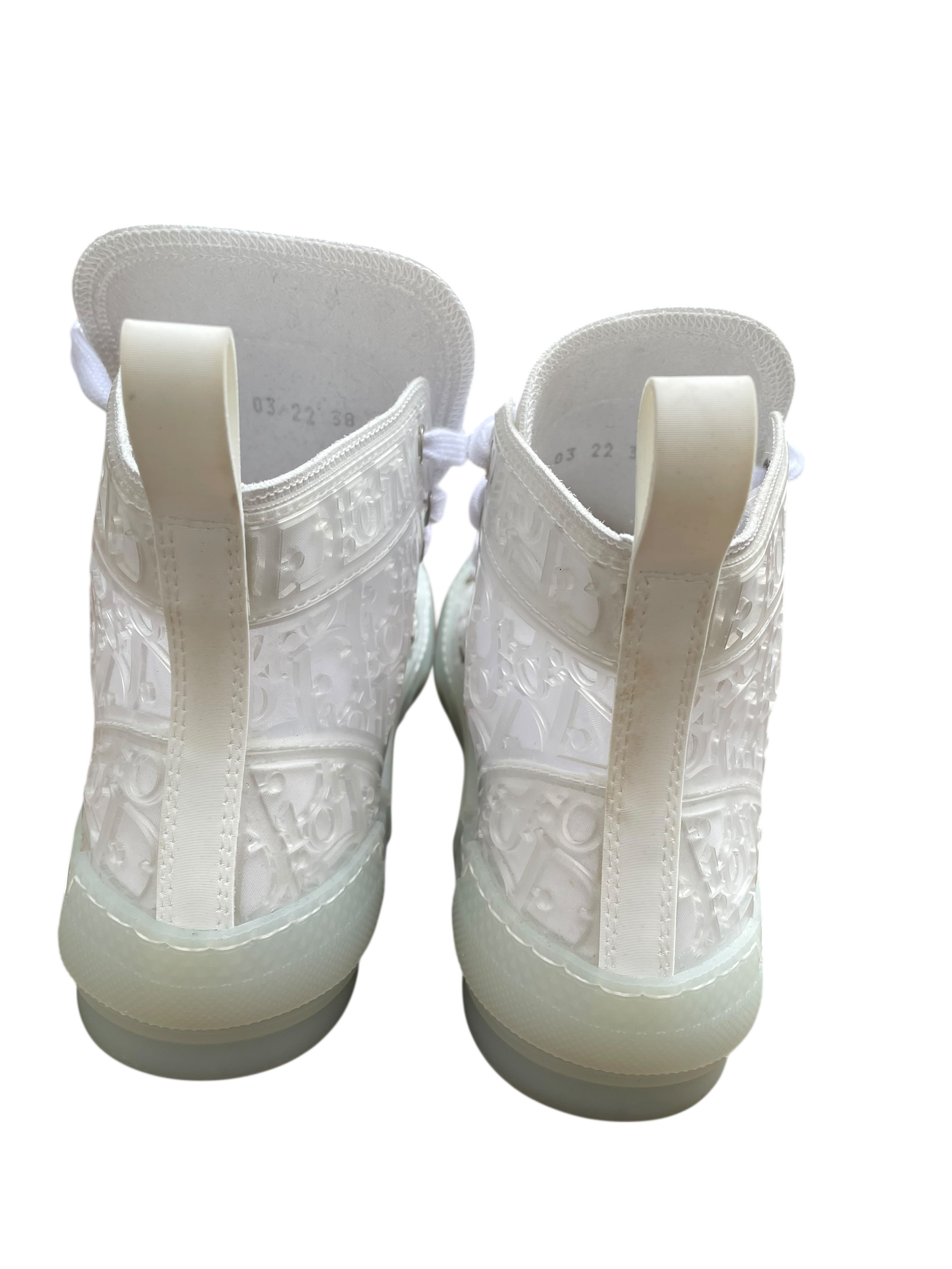 These Dior high-top sneakers reinterpret a classic silhouette through a distinctly modern lens. Crafted in a translucent material, they reveal an embossed Dior monogram throughout, creating a subtle play on texture and light. The frosted rubber sole and toe cap enhance the architectural feel of the design, while white laces and metal eyelets bring a clean, contemporary finish.