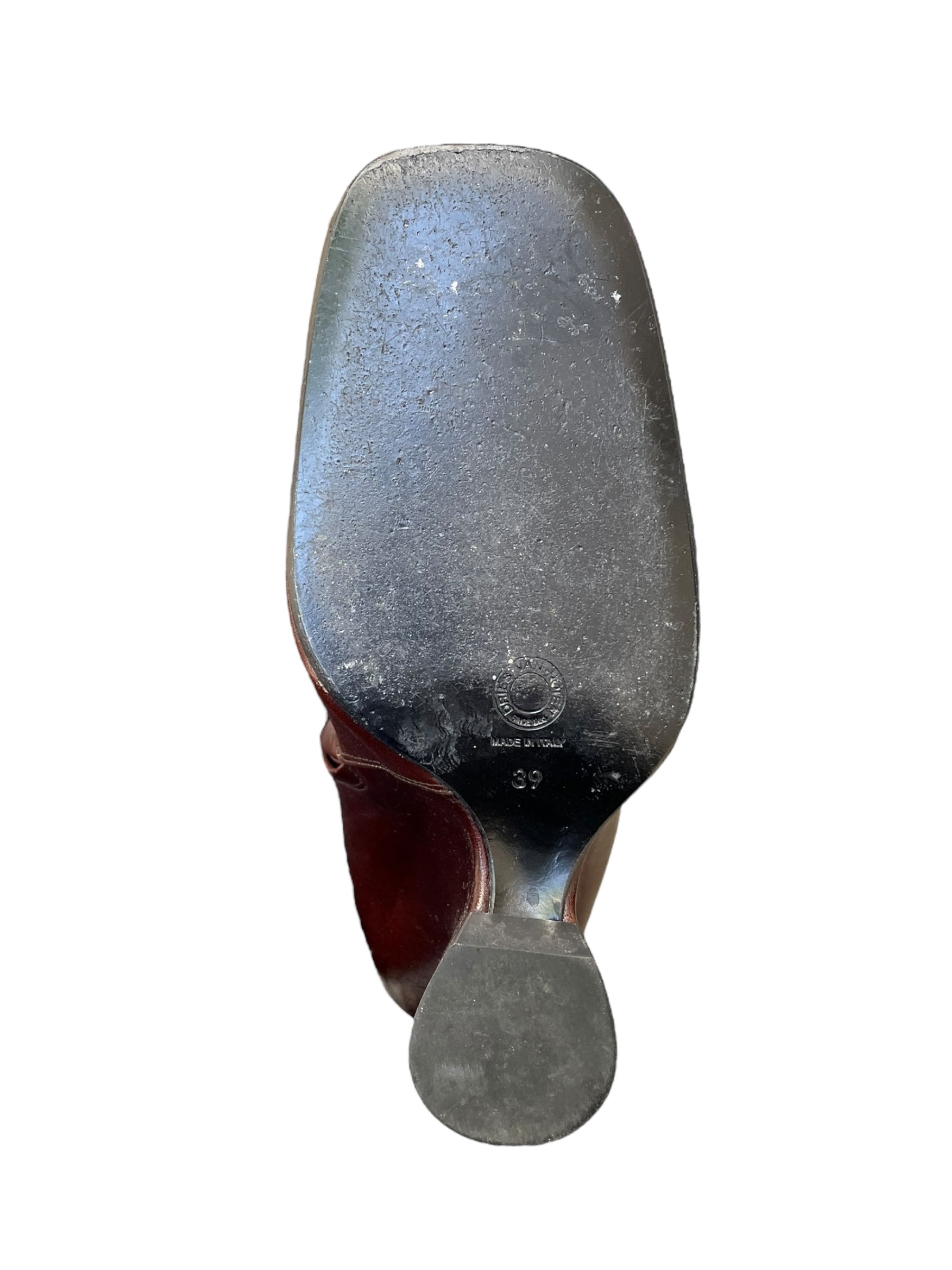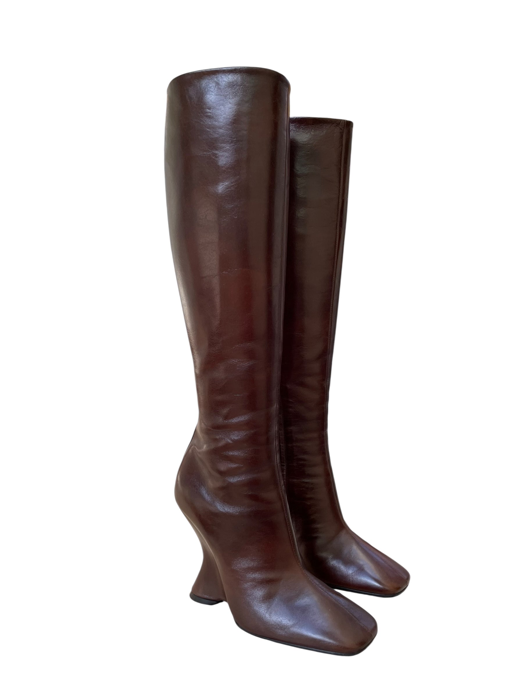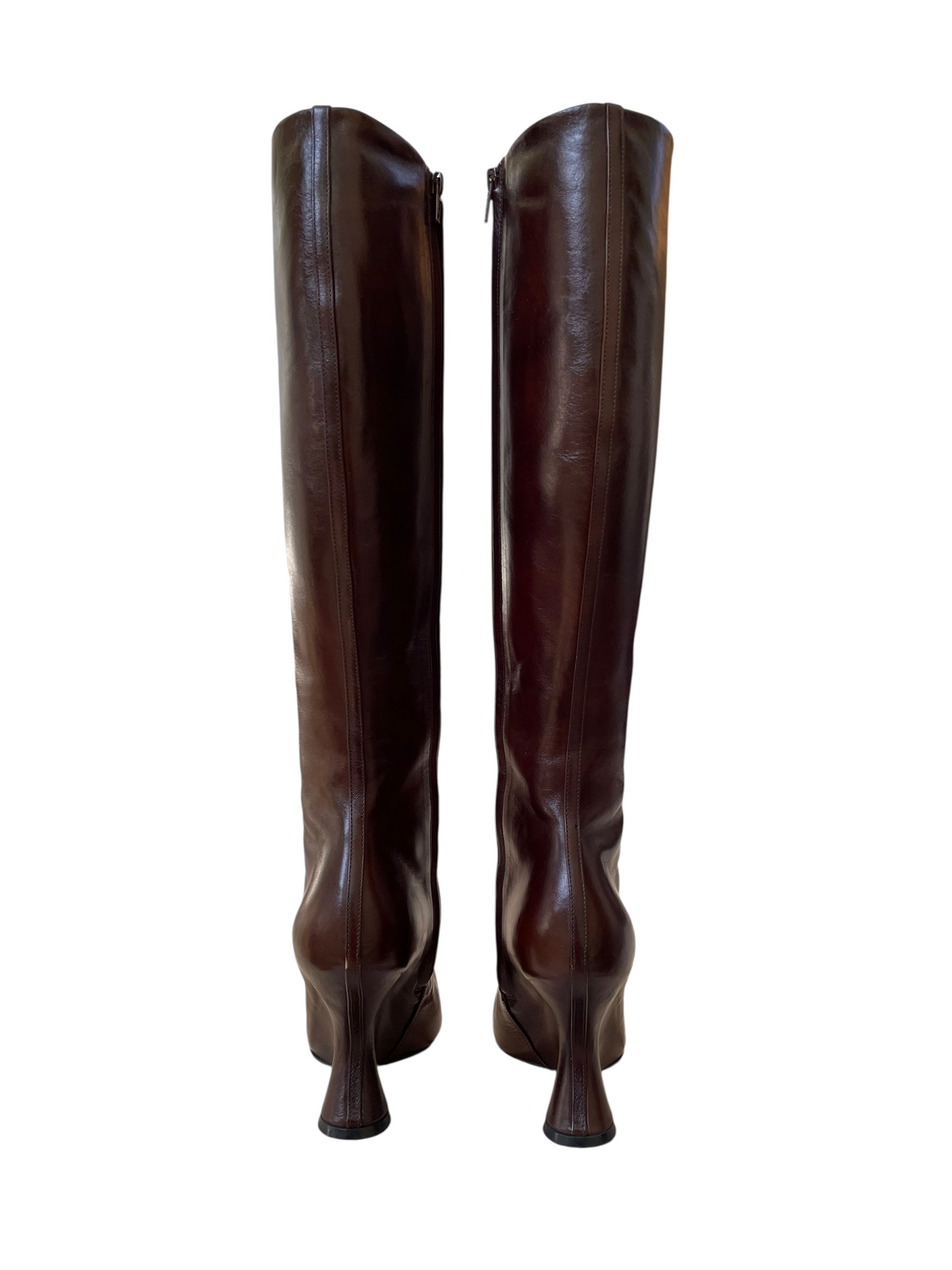 Combining contemporary elegance with the refined style of Dries Van Noten, these boots stand out with their rich burgundy-brown color and their silhouette that falls just below the knee, making them ideal for enhancing any outfit.
