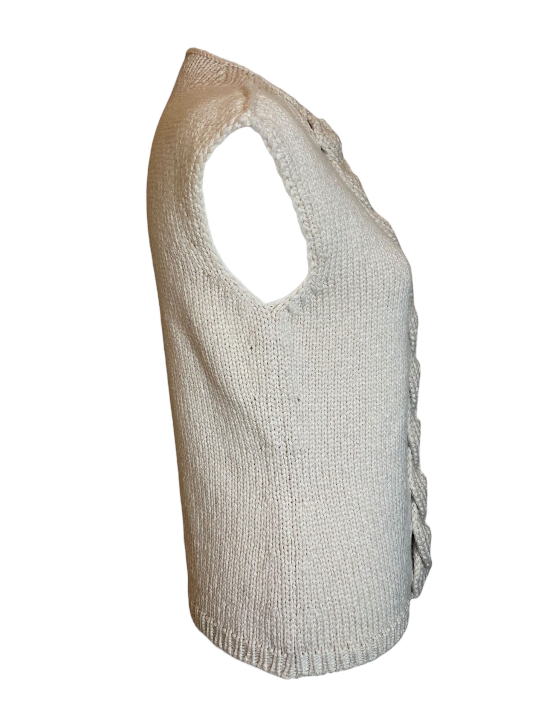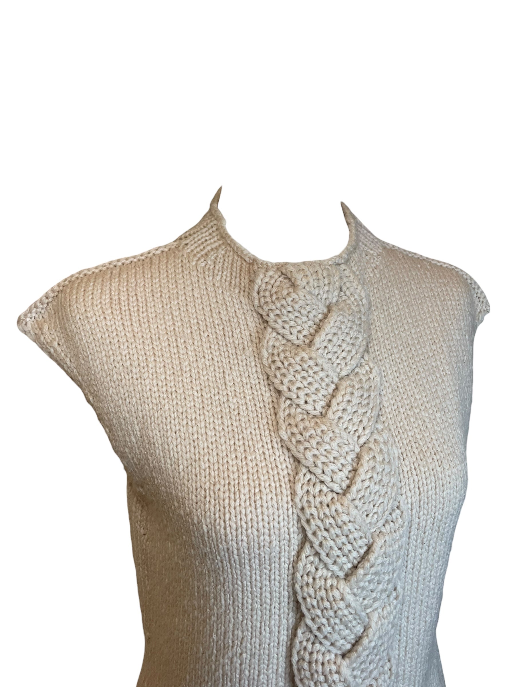 A refined and beautifully crafted piece from Lemaire, this sleeveless knit sweater comes in a soft ecru tone and features an elegant twist detail on the front. Its straight, close-to-the-body cut embodies the brand’s signature minimalist and sculptural aesthetic. A versatile piece perfect for layering or wearing on its own. In perfect condition.