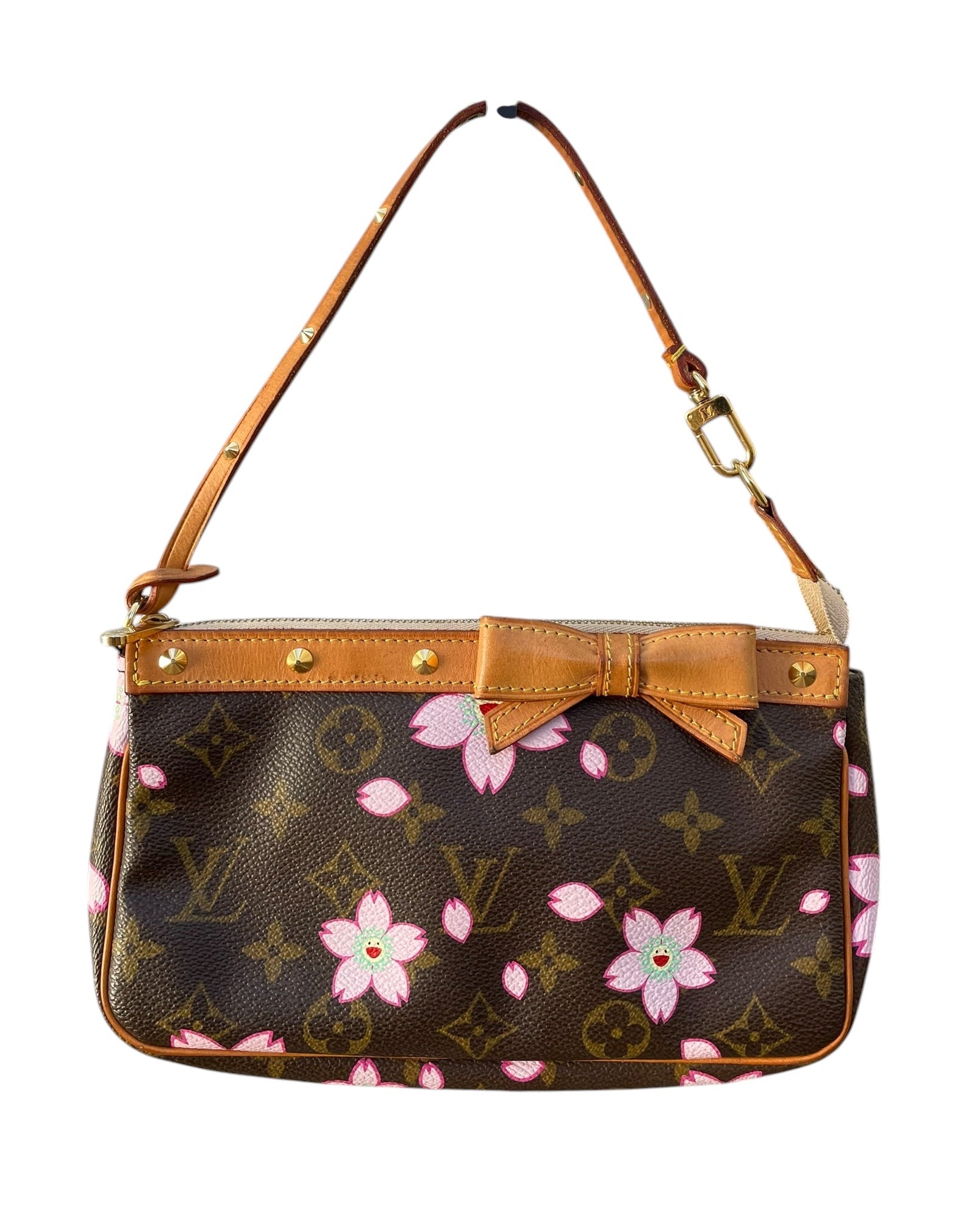 A rare and collectible collaboration piece between Louis Vuitton and artist Takashi Murakami, this pochette bag features the iconic brown monogram canvas adorned with pink floral details. Finished with natural leather trim and a charming bow on the front, it embodies playful elegance and artistic flair. The leather shows a light natural patina, adding subtle vintage charm.