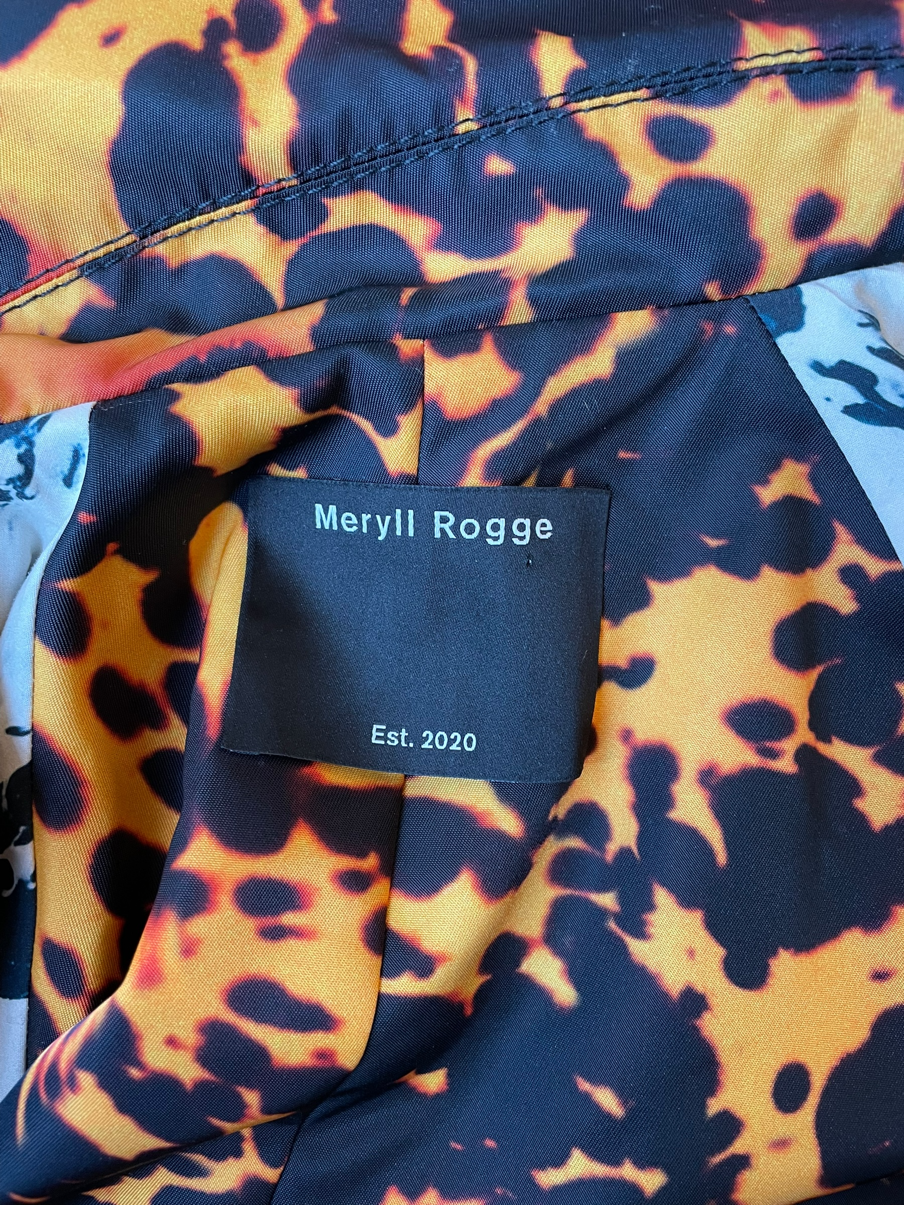 This Meryll Rogge coat features an abstract, mottled print in orange and black tones. Graphic and expressive, the pattern gives the piece a strong contemporary character without referencing a literal motif. The structured, straight silhouette brings balance and refinement to this bold outerwear design.