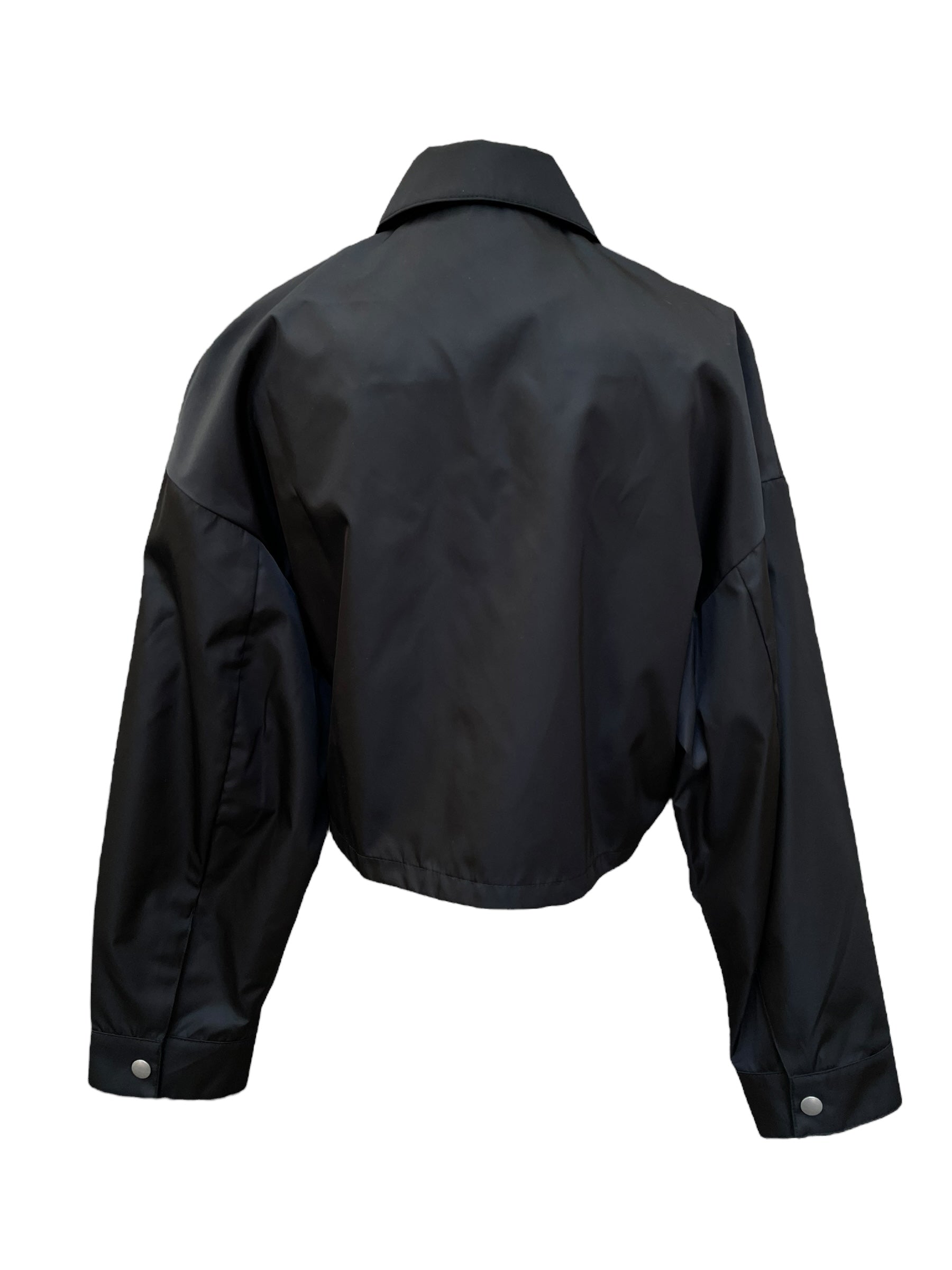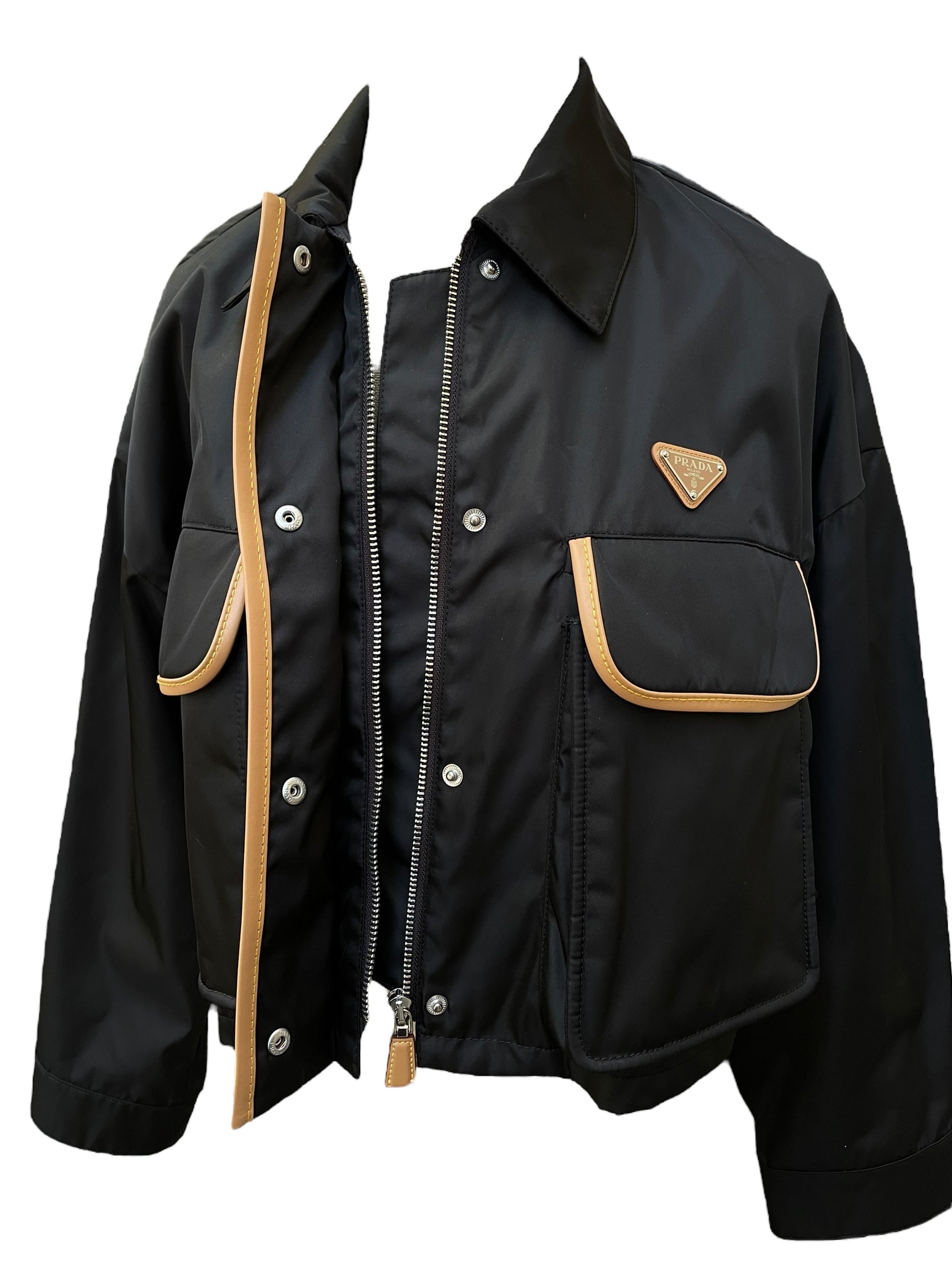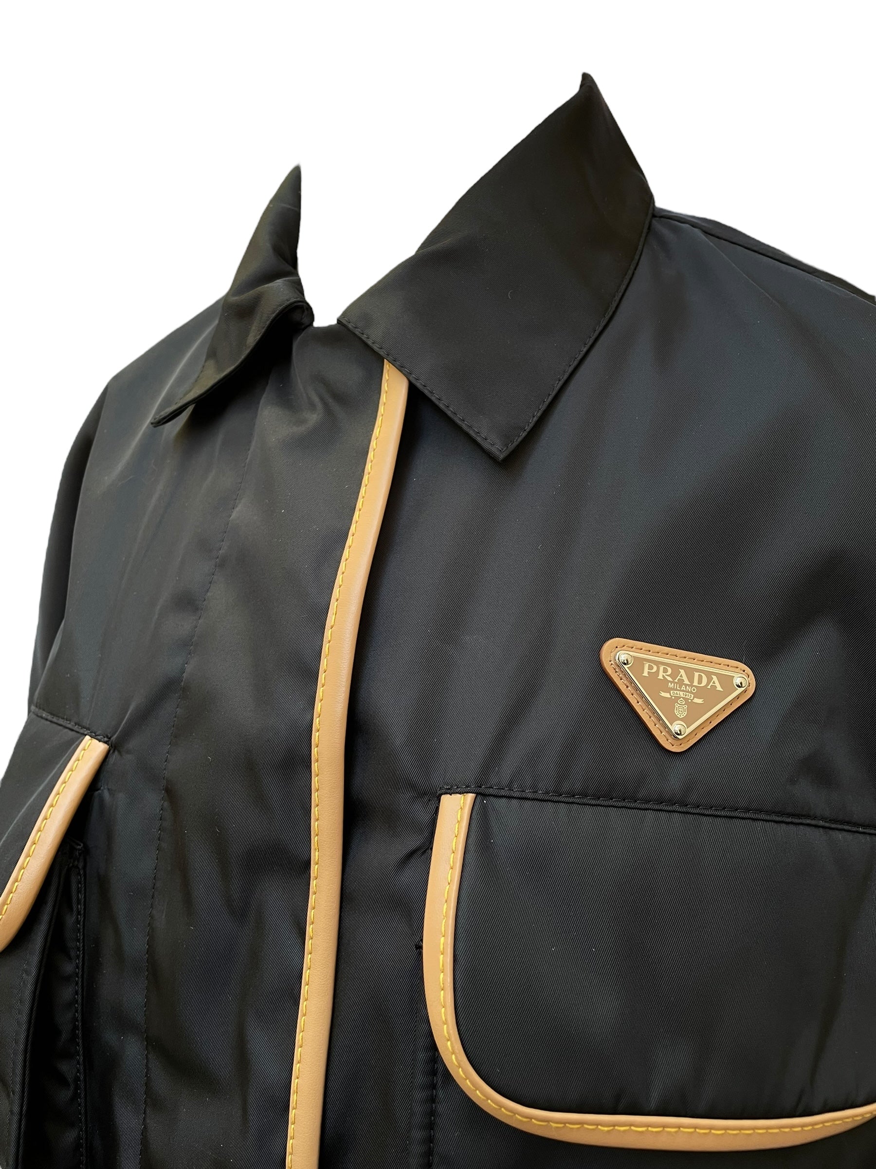 Combining contemporary style and functionality, this Prada jacket stands out thanks to its black, water-resistant technical fabric, perfect for protecting against the elements while maintaining a sophisticated look.