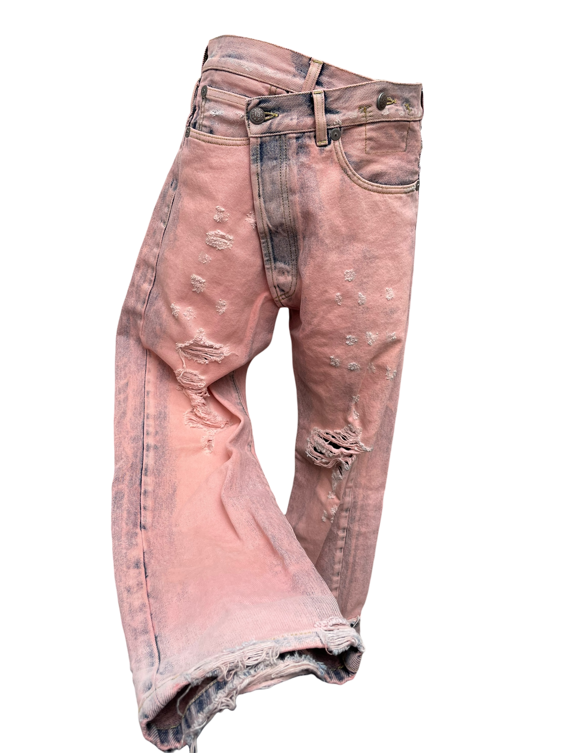These R13 jeans embody a bold and contemporary attitude. Featuring a faded pink wash with intentional distressed and ripped details, they stand out for their edgy yet refined aesthetic. A statement piece designed to elevate a modern, confident silhouette.